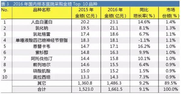 PDB数据显示,2016年国内样本医院采购金额领先的头号品种是人血白蛋白注射剂,为23.1亿元,占样本医院采购金额的1.4%;第二名是氯化钠(主要为氯化钠注射剂,其余为氯化钠溶液剂、氯化钠原料药),为21.1亿元,占1.3%;第三名是氯吡格雷片,为18.6亿元,占1.1%;第四名是单唾液酸四己糖神经节苷脂注射剂,为18.1亿元,占1.1%;第五名是恩替卡韦,为17.1亿元,占1.0%。2016年国内样本医院采购金额领先的品种见表3。
