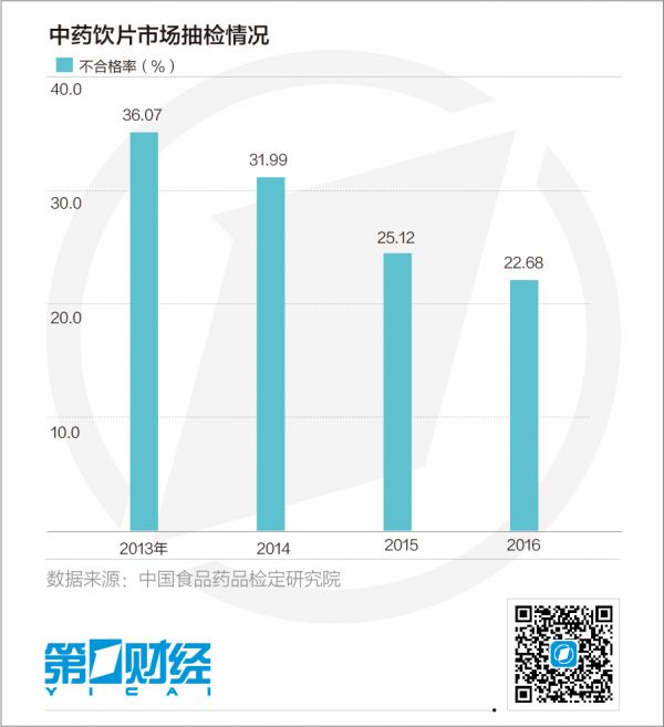 “2013~2016年全国药品质量抽验监测表明,中药材与饮片总体合格率分别为64%、68%、75%、77%,合格率呈逐年提升、稳步向好的趋势。但相对于其他药品,中药材及饮片的不合格率依然较高。”中国食品药品检定研究院(下称“中检院”)中药民族药检定所所长马双成对第一财经表示。