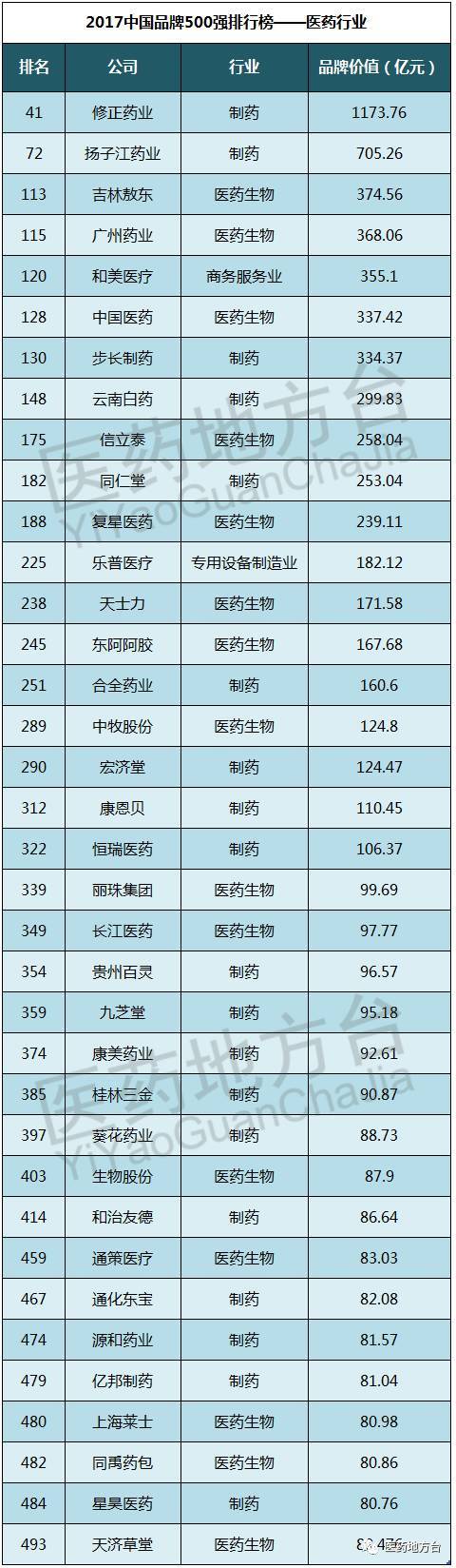 6月1日,亚洲品牌网发布了2017年中国品牌500强排行榜。据统计,共有36家医药企业上榜,总品牌价值达7333.376亿元。