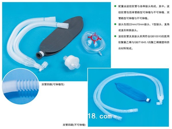 呼吸管路由基本配置组件和选用配置组成,基本配置由波纹管与各种接头构成,其中:波纹软管包含但管路型可伸缩与不可伸缩、双管路型可伸缩与不可伸缩,接头包括22mm/15mm接头、y型接头、直角或直行转换接头。选用配置包括呼吸过滤器、面罩、呼吸袋组件。