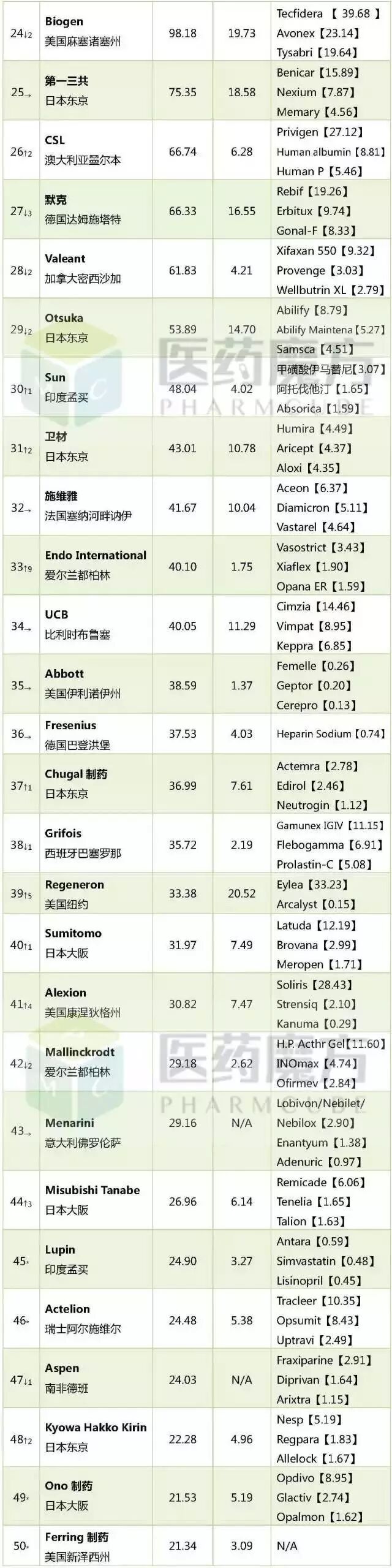 PharmExec (美国医药经理人杂志)6月12日公布了2017年全球制药企业排名top50。该排名主要依据2016年的处方药全球销售额,因此更能反映各家公司制药业务的整体实力。