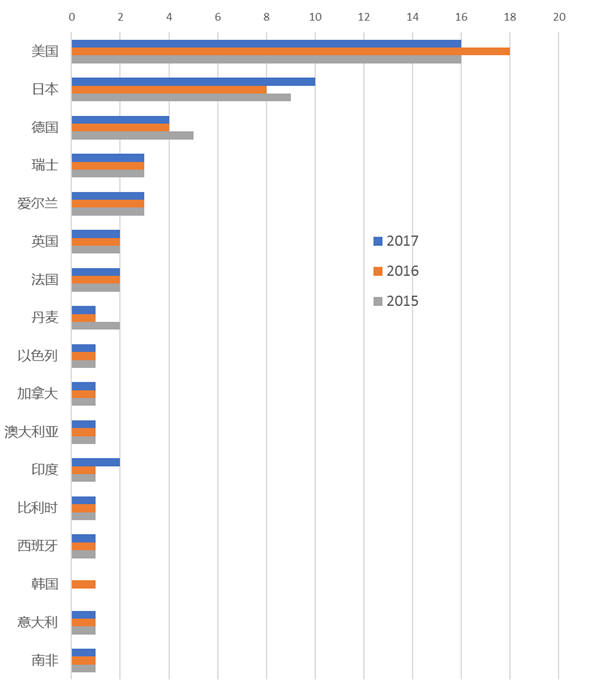 从地域上看,全球TOP50药企主要集中在美国、日本、德国、瑞士、爱尔兰、英国、法国等发达国家。亚洲地区除了日本外,主要有印度的Sun、Lupin两家仿制药企业进入2017年TOP50,其中Lupin是首次进入。
