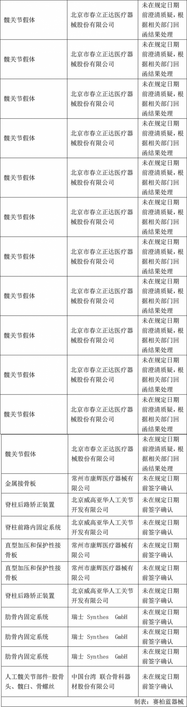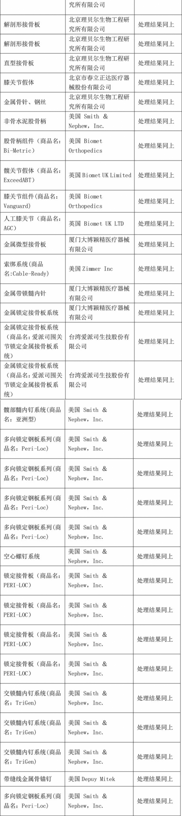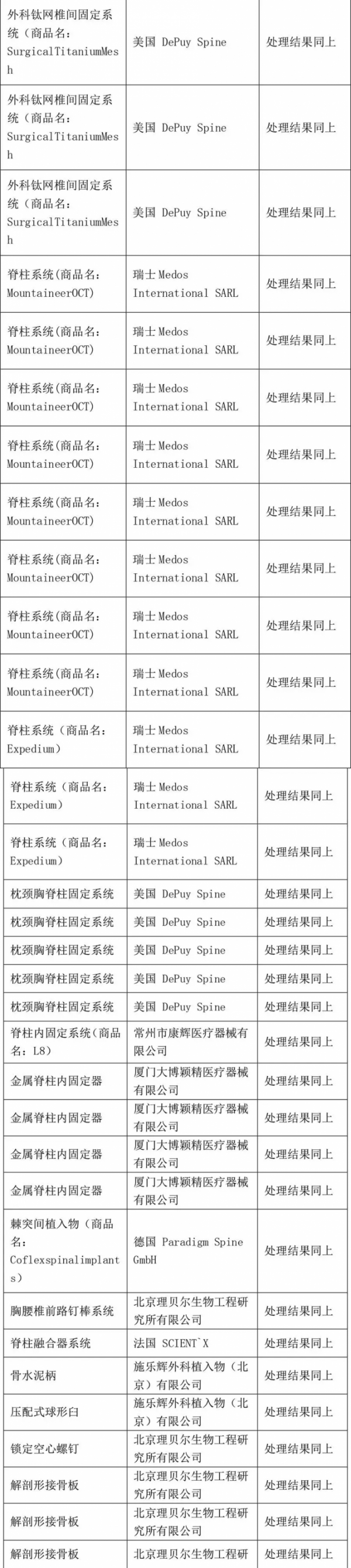 本次有多个生产企业的系列品种都受到了处罚。经初步统计-- 株洲市瑞邦医疗器材制品有限责任公司有10个品种波及;美国 Smith & Nephew,Inc.共有38个品种波及;北京理贝尔生物工程研究所有限公司共有23个品种被波及;中国台湾 联合骨科器材股份有限公司共有17个品种被波及;美国 DePuy Spine 11个被波及;北京市春立正达医疗器械股份有限公司 14个品种被波及。