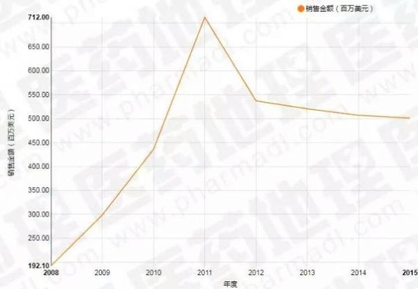 Opana ER 于 2006 年首次获批,用于治疗需要长期持续全天候阿片类止痛药的中度至重度疼痛。2012 年,Endo重新调整了Opana ER的配方,旨在使药品抵抗用于鼻吸或注射滥用的物理和化学操作。然而,更多的风险信息让FDA不得不采取措施将重新配方的Opana ER撤市。实际上,由于滥用遏制,2012年新配方的上市让Opana ER的销售额出现了一个较大的拐点,自那之后,Opana ER逐年走起了下坡路。
