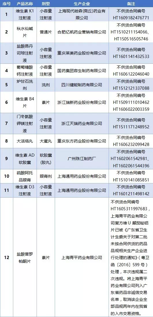 现依据《办法》第十二条规定,并经省药品集中采购制度改革专责小组成员单位同意,取消一次未按合同供货的生产企业所涉及具体品规(共11个)两年内在我省的入市交易资格;将二次不按合同供货的生产企业(1家)列入广东省药品非诚信交易名单,取消该企业全部品规两年内在我省的入市交易资格。