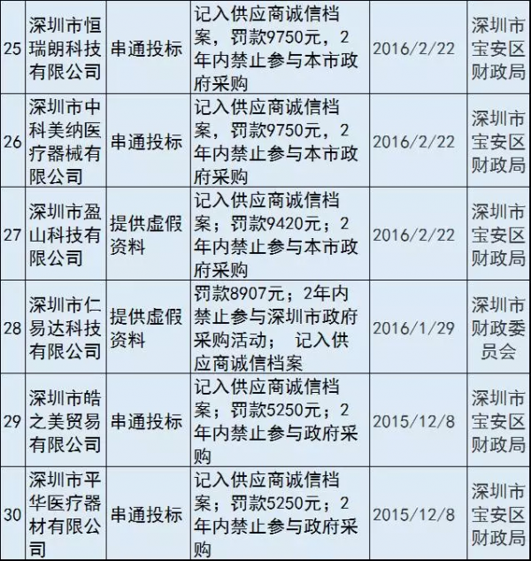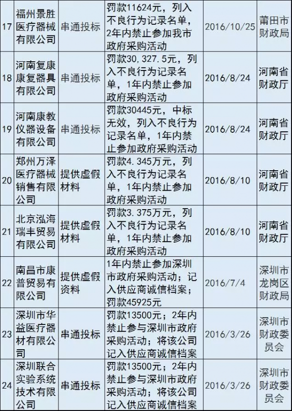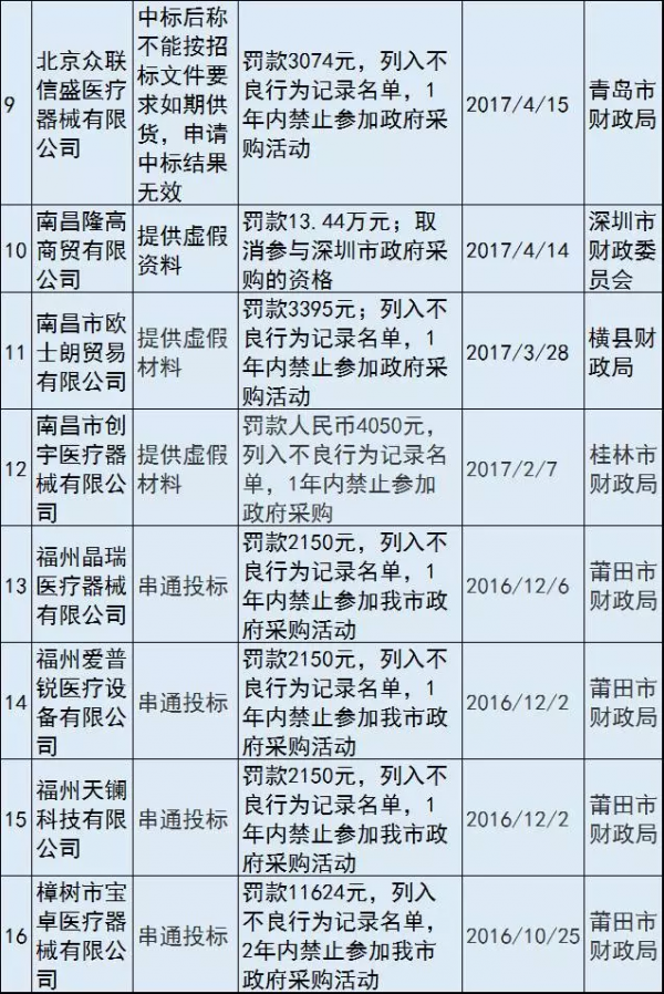 以下为被列入“政府采购严重违法失信行为信息记录”的医疗器械企业名录: