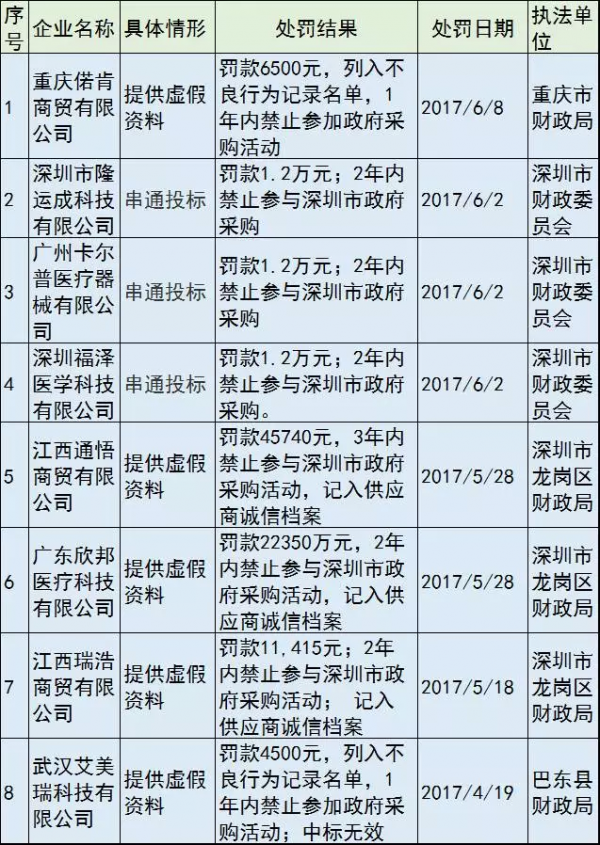 2017年6月,又有企业因为在医疗器械招投标活动中存在违法违规行为而被处罚。