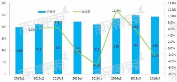 2016年广东省等级医院市场的总规模为937.03亿元,较2015年同比增长9.5%。从各个季度的环比增长来看,尽管第1季度、第4季度受年末、春节等因素影响有所回落,但2016年度广东省等级医院市场总体仍有9.5%的良好增长,尤其是2016Q2环比增长为11.7%,是拉动年度增长的主要动力。