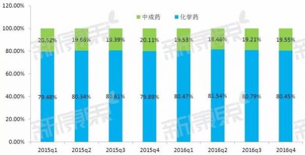 由于中药注射剂不良反应事件频发,导致中成药2016年在广东省等级医院市场上受一定程度影响。中西药占比方面,化学药占比是中成药的4倍,中成药占比在2016年较2015年有所下降。从分季度来看,中成药占比在第1、第4季度均高于第2、第3季度,并在2016年Q2创下两年的最低值。
