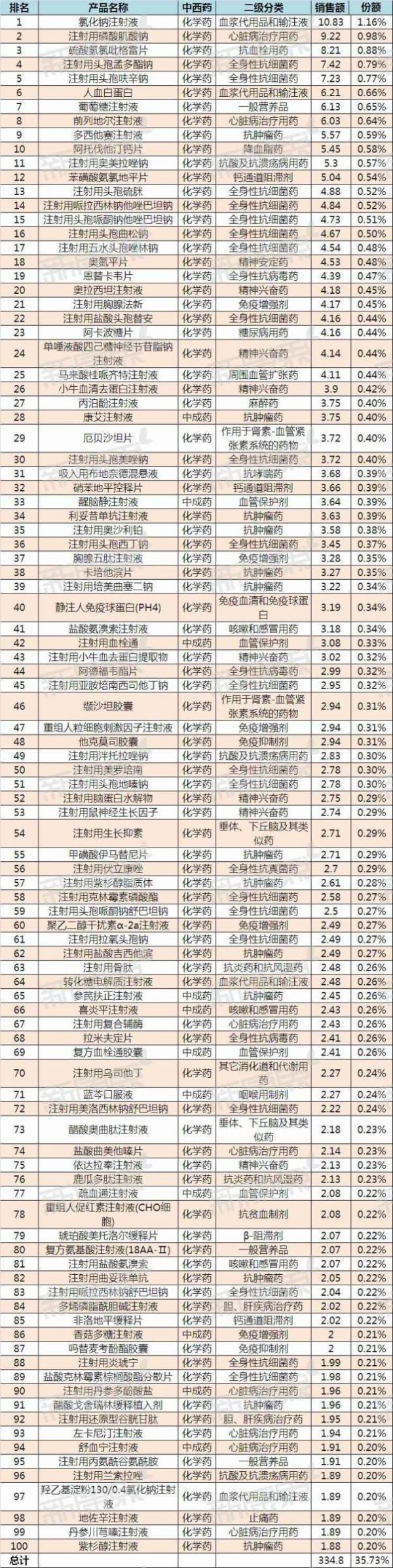 2016年广东省等级医院TOP100销售额为334.80亿元,同比2015年TOP100增长11.9%,占广东省总体规模的35.7%。TOP100品种中,化学药有89个,中成药仅有11个。在适应症方面,共有全身性抗感染药25个品种入围,其次是抗肿瘤和免疫调节剂、心血管系统药物,均有20个品种;神经系统药物10个品种,消化系统及代谢药7个品种,血液和造血系统用药6个品种……TOP10品种中心血管系统药物、血液和造血系统用药均占有3个席位。排名首位的是氯化钠注射液(销售额10.83亿元,份额1.16%),其次为注射用磷酸肌酸钠(9.22亿元,0.98%),中成药中排名最高的是康艾注射液(3.75亿元,0.40%)。