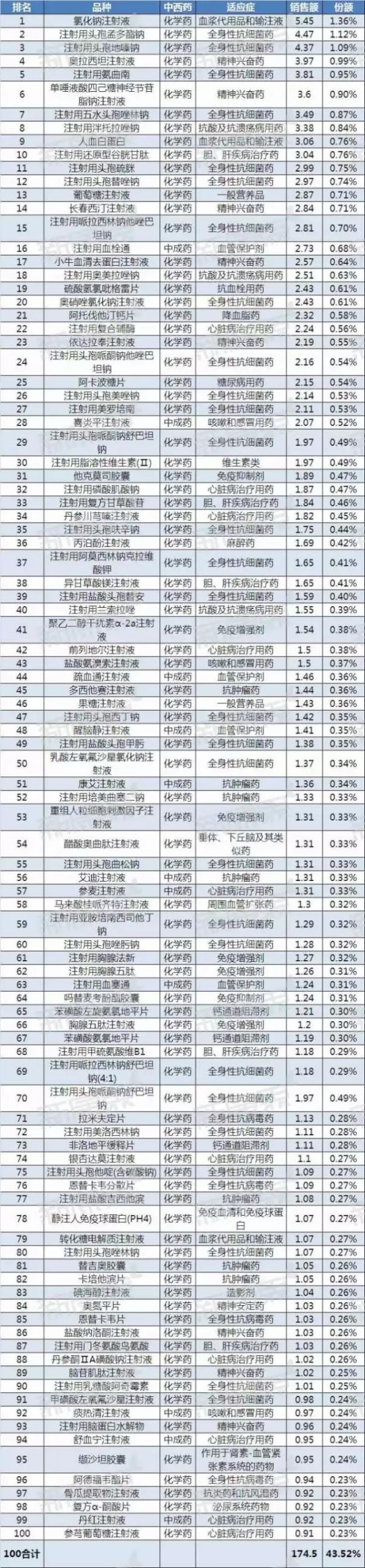 TOP10品种中有4个全身性抗感染药品种,分别是排名第2的注射用头孢孟多酯钠、排名第3的注射用头孢地嗪钠、排名第5的注射用氨曲南和排名第7的注射用五水头孢唑林钠,合计销售额16.1亿元,份额占总体市场4.0%。氯化钠注射液以销售额5.45亿元,市场份额1.36%排名首位,中成药排名最高的是注射用血栓通(2.73亿元,0.68%,第16名)。