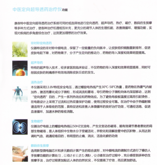 康森特中医定向超声透皮治疗是由中医定向超声透皮仪和理疗电极片组成,是根据生物电药导理论、仿生学、热敷医学、中国古典中医医学及现代微电脑技术,结合多年临床实践和大量用户反馈意见的基础上研制开发的新一代医疗仪器。仪器在设计上应用了先进的超声、中频电磁技术,成功的把药物定向导入和中频仿生按摩治疗技术及温热疗法融为一体,使该机具有定向药物导入、中频仿生按摩、热敷治疗的多重功能,调制的中频电流能促进皮肤电阻下降,扩张小动脉和毛细血管,改善局部血液循环,比低频电流更能到达人体组织的深部,靶向作用于患者病灶。