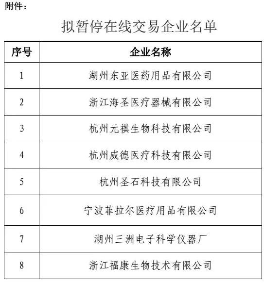 6月9日,该中心发布通知称,根据浙江省食药监局发布的飞检公告,以及浙江省药械集中采购有关文件规定,拟暂停湖州东亚医药用品有限公司等8家企业在浙江省医用耗材采购系统的在线交易资格。这8家械企包括: