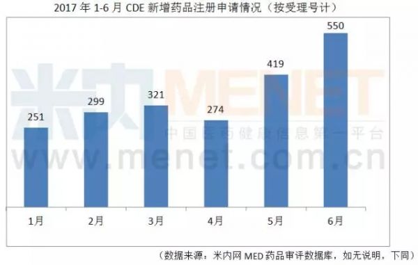 据米内网MED药品审评数据库统计,6月份CDE新增药品注册申请550个。从总体上看,2017上半年新增药品注册申请量呈上升趋势。