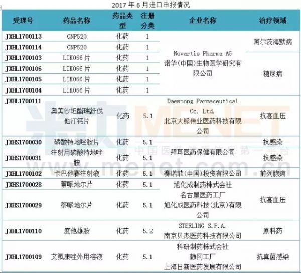 6月份CDE新增进口申请28个,涉及18个品种,以5类的申请较多。6月进口申请中有2个1类新药申报临床,均由诺华申报,分别是CNP520原料药以及LIK066片。