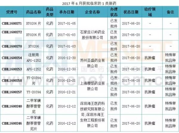 6月份有4个1类新药获批临床,分别是石家庄以岭药业的XY0206原料药及其片剂,苏州亚盛药业的APG-1252原料药及其注射剂,上海璎黎药业的YY-20394原料药及其片剂以及深圳海王医药的二甲苯磺酸萘普替尼原料药及其片剂。