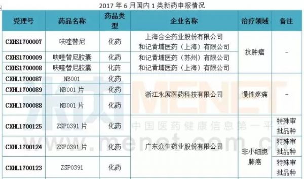据米内网MED药品审评数据库,2017年6月新增新药申请65个,其中属于1类新药的申请有38个,涉及13个品种。呋喹替尼完成临床试验阶段后在本月申报生产。广东东阳光药业在6月有3个1类新药进入CDE,分别是利他匹仑原料药及其片剂,HEC74647PA原料药及其片剂和HEC68498钠盐及其片剂,但目前暂未检索到这3个品种的具体信息,加上此前3月申报的康达瑞韦钠和HEC30654AcOH,东阳光在2017上半年共有5个1类新药进入CDE。下面是6月部分新增1类新药的简介——