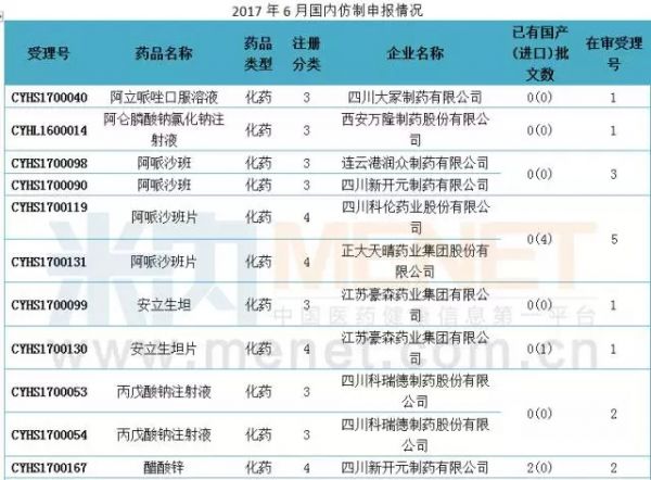 6月新增国内仿制申请50个。据米内网MID药品索引数据库统计,6月进入CDE的仿制申请中有19个品种目前尚无相关国内厂家的生产批文。此外,阿哌沙班片、安立生坦片、达沙替尼原料药、氟比洛芬酯注射液、吉非替尼原料药、精氨酸谷氨酸原料药、盐酸莫西沙星片、盐酸普拉克索片、注射用帕瑞昔布钠和注射用紫杉醇(白蛋白结合型)等10个品种目前是国内的独家品种。值得一提的是,注射用帕瑞昔布钠和盐酸莫西沙星原料药的在审受理号均达48个,有扎堆申报迹象。