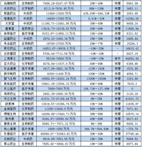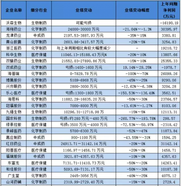 根据已经发布业绩预告的药企情况来看,其中有34家净利出现下降或亏损。其中沃森生物、双成药业、绿景控股和海虹控股在2016年同期已是亏损,则今年继续亏损。