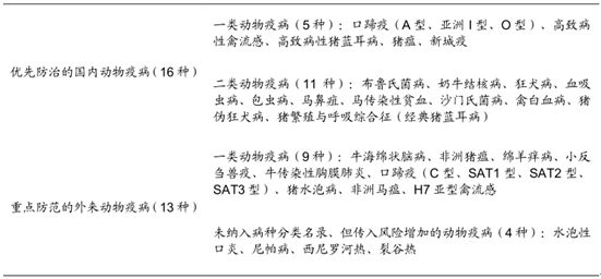 根据规划,我国优先防治和重点防范的动物疫病有 29 种,其中优先防治的国内一类动物疫病有 5 种,包括口蹄疫(A 型、亚洲 I 型、O 型)、高致病性禽流感、高致病性猪蓝耳病、猪瘟、新城疫。