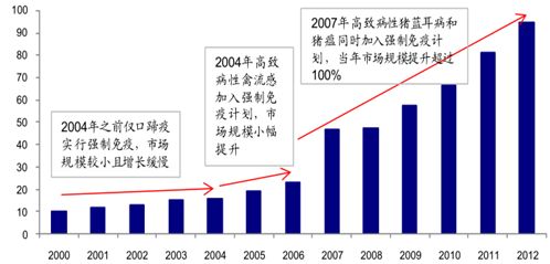 强制免疫推动我国动物疫苗市场规模迅速扩大(亿元)