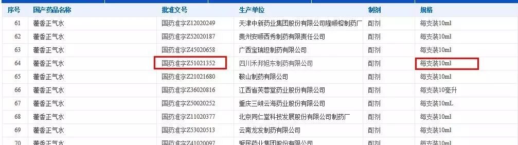 ▲食药监总局官网显示,该企业所生产的藿香正气水批准文号为“国药准字Z51021352”,规格为每支装10ml。