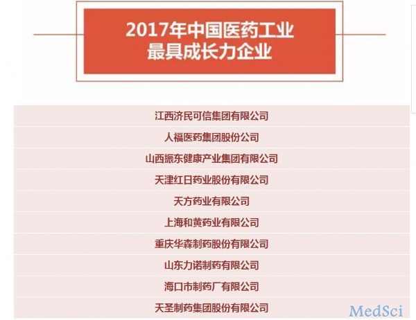 9月2日,“2017年中国医药工业最具成长力企业”榜单在2017年(第34届)全国医药工业信息年会上隆重揭晓。江西济民可信集团有限公司、人福医药集团股份公司、山西振东健康产业集团有限公司等知名企业上榜。
