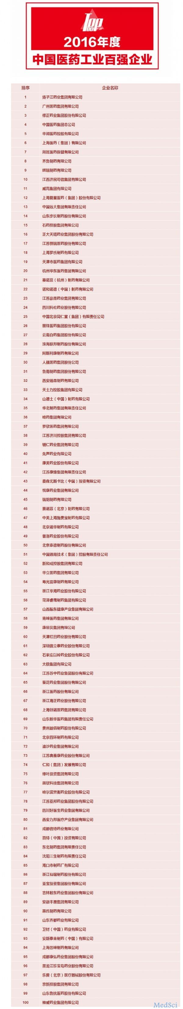 9月2日,由中国医药工业信息中心主办的2017年(第34届)全国医药工业信息年会在成都盛大开幕,大会隆重发布了备受行业关注的工信部2016年度中国医药工业百强企业榜单。扬子江药业集团有限公司、广州医药集团有限公司、修正药业集团股份有限公司位列前三甲。