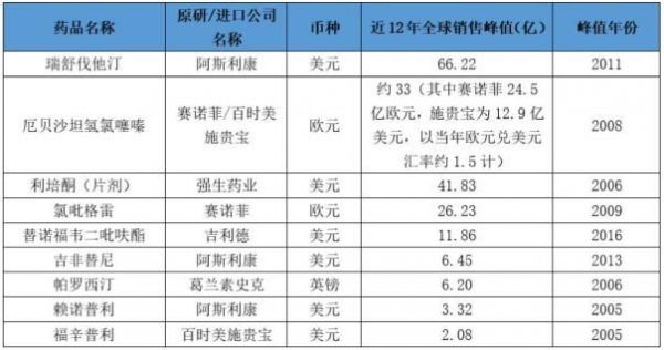 根据笔者检索,12个通用名品种涉及的同剂型原研厂家有9个品种的自2005年以来全球销售数据资料,大多数品种的峰值出现在2010年及以前。
