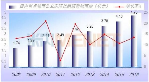 据米内网数据显示,2016年我国全身性抗过敏药物(主要指抗组胺药物)销售额超过50亿元,同比上一年增长了5.1%。其中重点城市公立医院抗组胺用药金额达4.76亿元,同比上一年增长了13.72%。