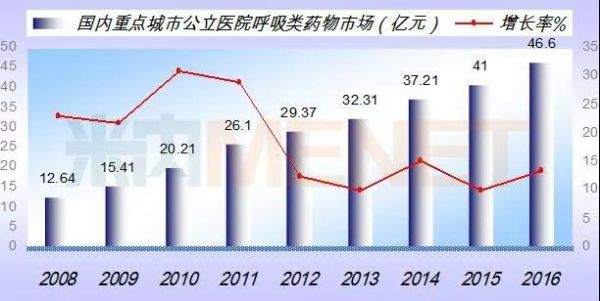 据米内网数据显示,2016年我国呼吸道化学药总销售额为500亿元,其中重点城市公立医院呼吸道化学药市场达46.6亿元,同比上一年增长13.66%。