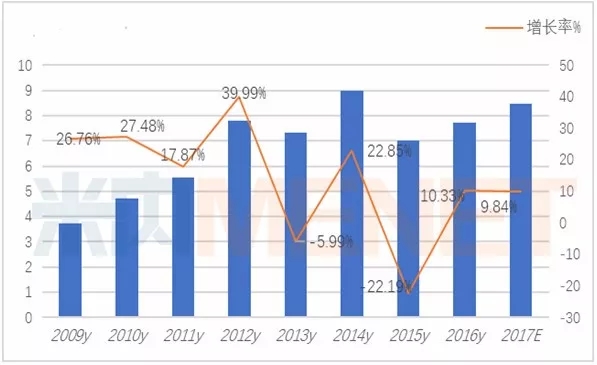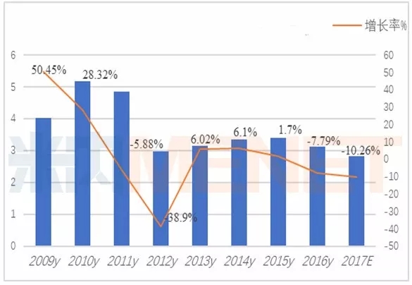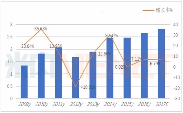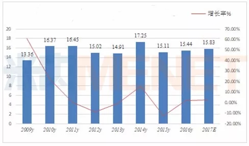 图1:2009-2017年中国重点城市公立医疗机构终端复方青霉素销售额(单位:亿元)