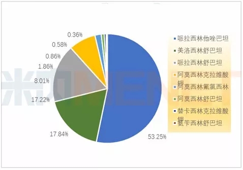 在全身抗感染药物中,抗生素复方制剂主要由β-内酰胺酶抑制剂与头孢类或青霉素类抗生素组成。2017年《国家医保目录》中,复方青霉素β-内酰胺酶抑制剂占据了主要地位。新《国家医保目录》中收载哌拉西林钠他唑巴坦钠注射剂、美洛西林钠舒巴坦钠注射剂、哌拉西林钠舒巴坦钠注射剂、阿莫西林钠舒巴坦钠注射剂、氨苄西林钠舒巴坦钠注射剂、替卡西林克拉维酸钾注射剂和阿莫西林克拉维酸钾注射剂、口服常释剂、口服液、颗粒剂等7个药品,是国内复方抗生素的主要基础药物。