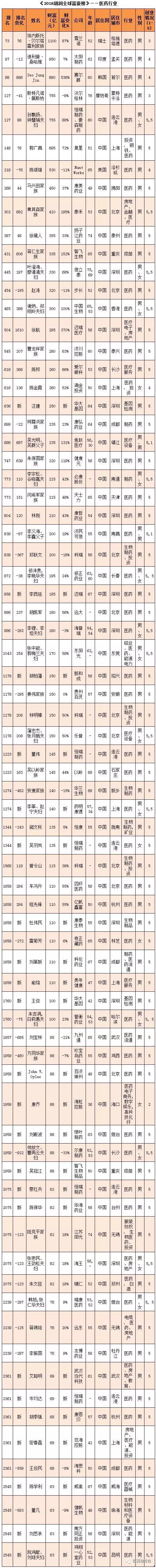 不过占据医药行业前三的富豪来自瑞士、印度和韩国,分别是雪兰诺的埃内斯托·贝尔塔雷利家族,财富1100亿元;太阳制药的迪利普·桑哈维,财富950亿元;赛尔群的Seo Jung Jin,财富880亿元。