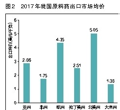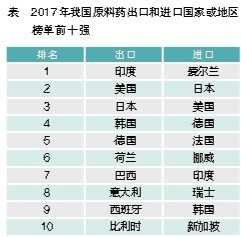2017年,随着全球经济明显回暖和我国经济发展好于预期,我国原料药产品进出口贸易在经过两年的调整后重现较快增长局面,进出口额再创新高,达到378.4亿美元,同比增长13.84%,在西药贸易中占比54.5%,较2010年减少16%。相对而言,附加值较高的西药制剂和生化药产品进出口额在西药贸易中所占比重不断加大,反映出我国医药产业转型升级取得显著成果。
