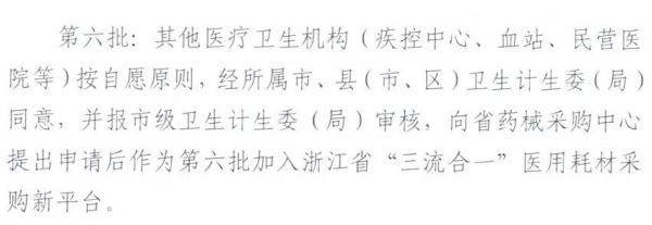 2018年3月2日,浙江省药械采购中心印发《浙江省“三流合一”医用耗材采购新平台推进工作方案》。