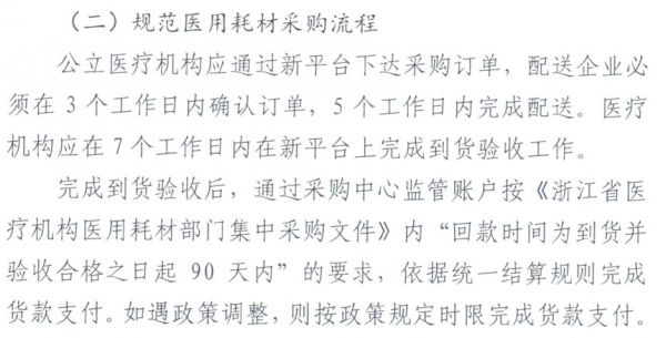 《浙江省“三流合一”医用耗材采购新平台推进工作方案》明确提出,“回款时间为到货并验收合格之日起90天内”。