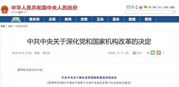 据新华社3月4日报道,中国共产党第十九届中央委员会第三次全体会议通过《中共中央关于深化党和国家机构改革的决定》(下称《决定》),并正式对外公布。
