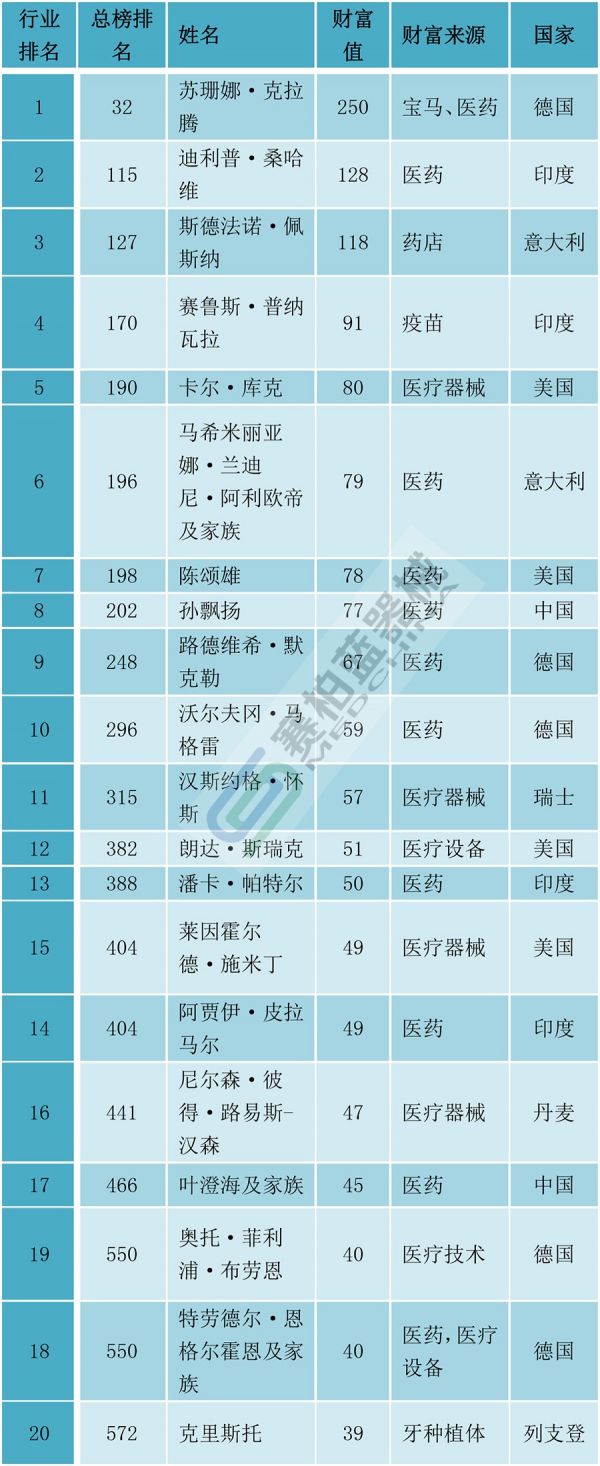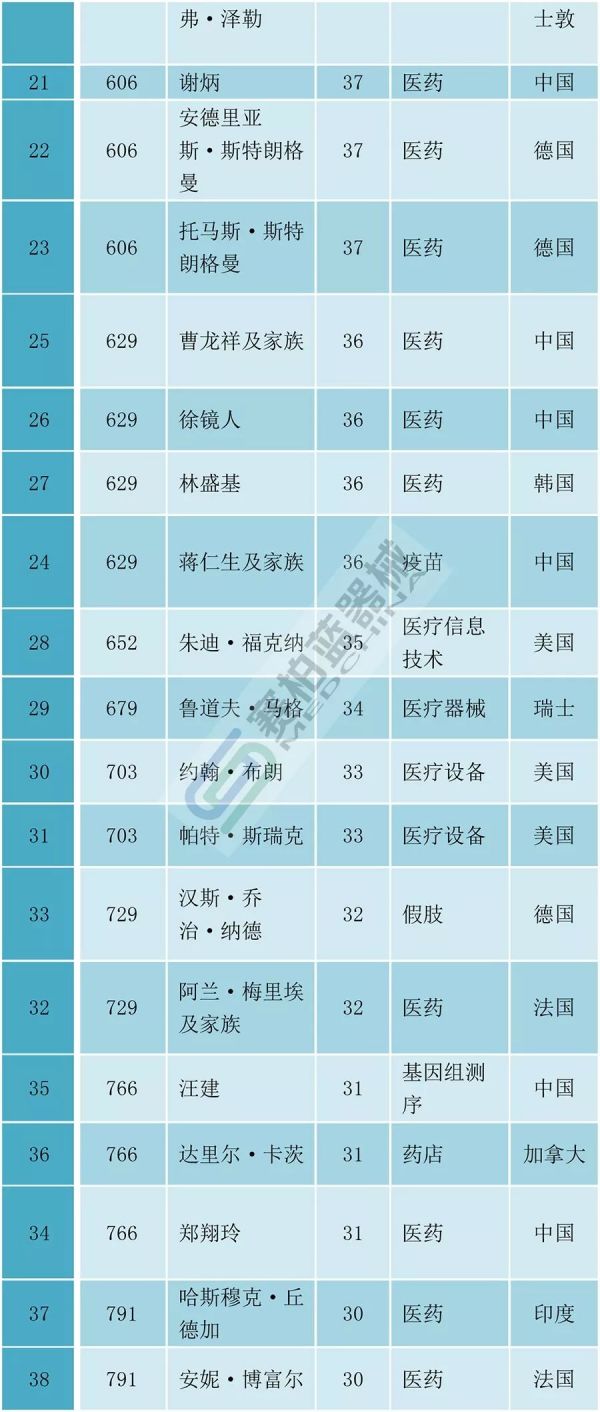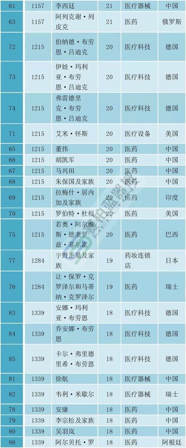 来自中国的上榜富豪中,医药类有32人,医疗设备6人。排名最高的是恒瑞孙飘扬,财富值77亿美元,其次是叶澄海及家族的45亿美元,第3是谢炳的37亿美元,第4是蒋仁生及家族、曹龙祥及家族、徐镜人,财富值都是36亿美元;排名第5是郑翔玲、汪建,财富值都是31亿美元,其中郑翔玲是排名第3的谢炳的夫人,两人财富值合计为68亿美元,汪建则是医疗器械圈华大基因的董事长。