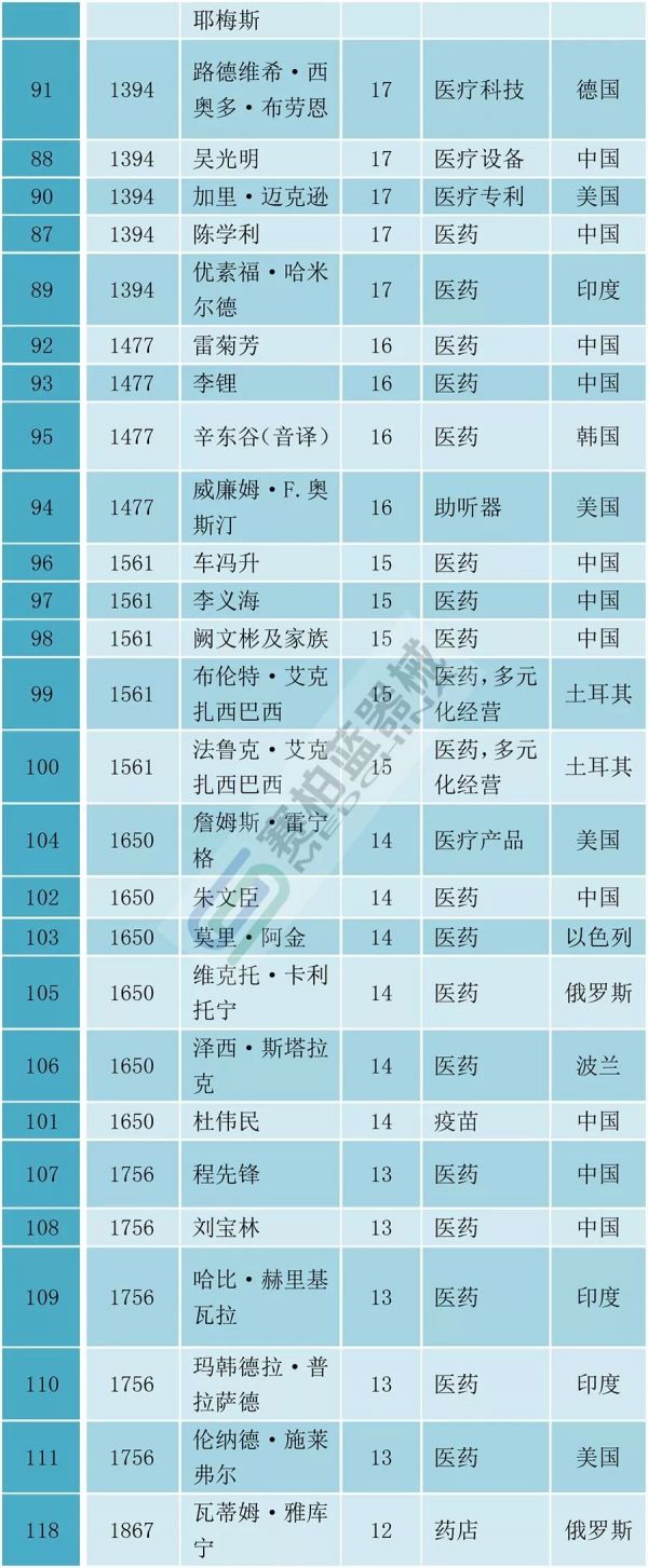 在125位上榜的医药富豪中,有38人来自中国, 20人来自美国,19人来自德国,16人来自印度,6人来自瑞士,4人来自法国;俄罗斯、意大利、加拿大分别有3人上榜;韩国、土耳其各有2人上榜;丹麦、波兰、巴西、阿根廷、日本、芬兰、南非、以色列、新加坡、列支登士敦各有1人上榜。
