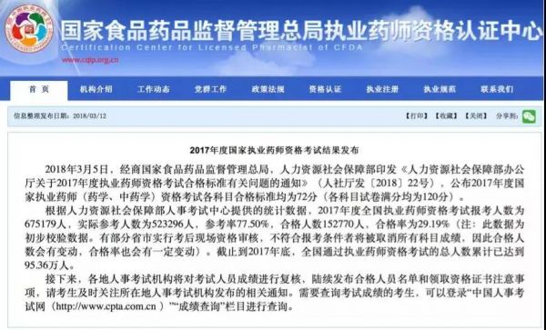 3月12日,国家食品药品监督管理总局执业药师资格认证中心发布《2017年度国家执业药师资格考试结果》的公告。