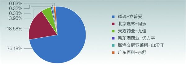 在2017年国内重点城市公立医院阿托伐他汀市场中,辉瑞公司的“立普妥”占据76.18%的份额,北京嘉林药业的“阿乐”占据18.58%的份额、河南天方药业的“尤佳”占据3.96%的份额,浙江新东港药业、斯洛文尼亚莱柯公司和广东百科3家企业的产品合计占据1.28%的份额(见图2)。而浙江新东港药业、斯洛文尼亚莱柯公司和广东百科的该类产品增长率较高。