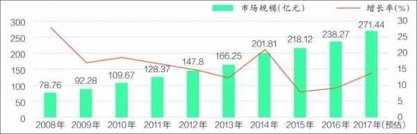 图为2008年~2017年国内调血脂用药市场规模增长情况