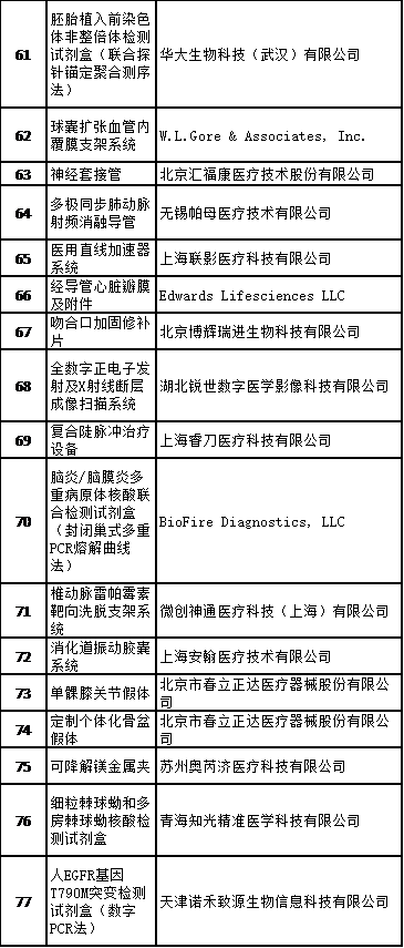 据药监总局官网数据,自2017年以来,进入总局特别审批通道公示的产品共有77个,涉及71家医疗器械企业,其中,微创医疗的产品进入特别审批通道最多,数量有6个。