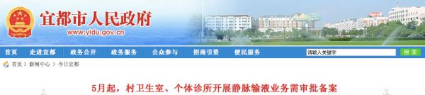 近日,湖北宜都市人民政府官网发布通知,明确要求从5月1日起,该市所有村卫生室、个体诊所未经审批备案不得开展静脉输液业务。