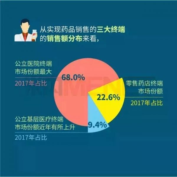 米内网的数据也佐证了这一现实。据米内网统计数据,2017年我国三大终端六大市场药品销售额实现16118亿元,同比增长7.6%。从实现药品销售的三大终端的销售额分布来看,公立医院终端市场份额最大,2017年占比为68%。