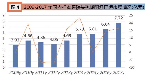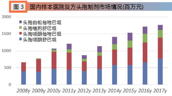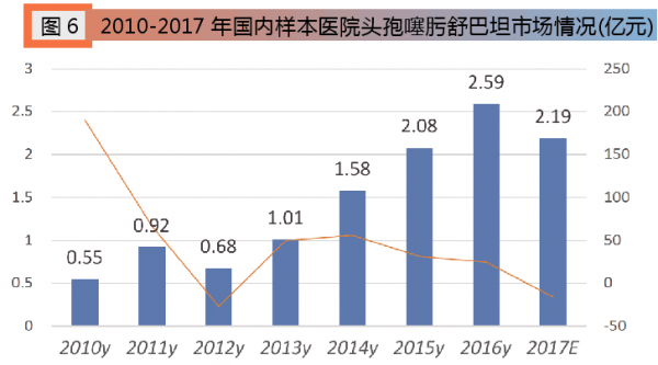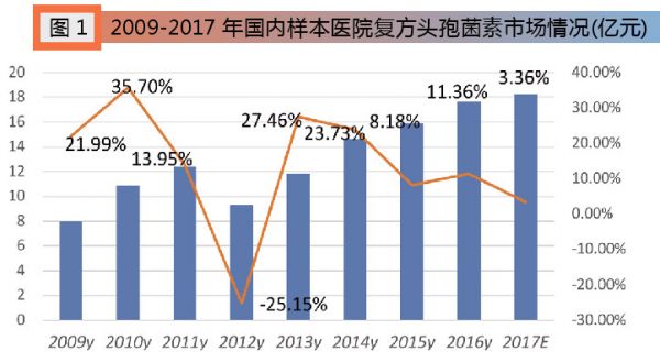 据米内网数据,2016年国内重点城市公立医院复方头孢β内酰胺酶抑制剂类购药金额为17.65亿元,同比上一年增长11.36%。预测2017年国内重点城市公立医院复方头孢β内酰胺酶抑制剂购药金额为18.24亿元,同比上一年增长率仅为3.36%,增长率相比上一年下降了8个百分点。