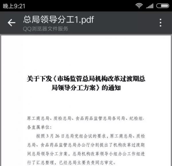 据截图信息,该文件是由国家市场监管总局机构改革领导小组办公工作组于3月29日下发的“通知”,该通知名称为“关于下发《市场监管总局机构改革过渡期总局领导分工方案》的通知”。该通知正文很短,如下: