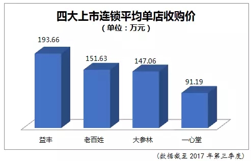 受新医改相关政策的影响,许多处方药企纷纷转向OTC市场,但他们通常都是首选门店数和销售规模都相对占优的百强连锁或各地二三线城市的区域龙头,而规模在将来更加激烈的资源争夺战中起着重要的作用。不过发展规模的代价不低,从2015~2017年,四大上市连锁中平均单店收购价格最高的是益丰,为193.66万元,最低的是一心堂,为91.19万元。也就是说,如果没有外来资本的注入,连锁药店想在短期内迅速做大是不可能的;在上市前,除非多轮融资,否则想一直保持快速扩张的势头也是一道难题。