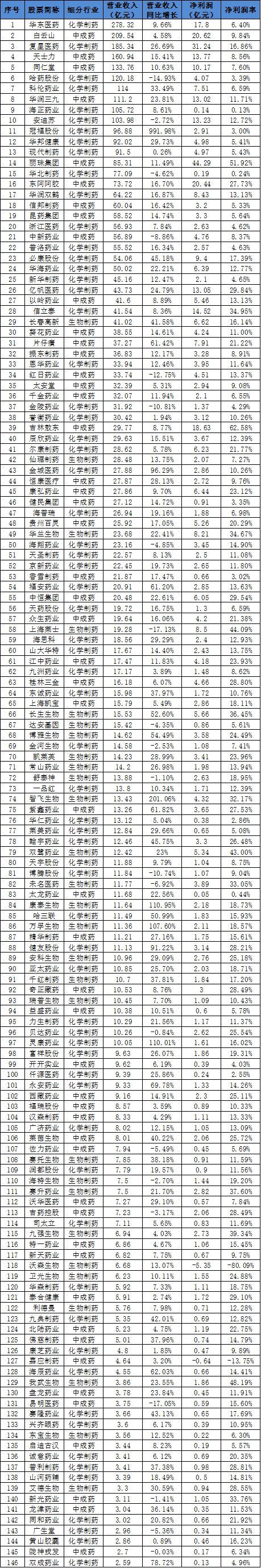 注:①146家A股上市公司为天士力、复星医药、华润三九等公司;中成药、生物制药和化学制药(含原料药),细分行业分类根据通达信软件划分,供参考。②医药制造业数据来源于统计局,合计利润及其同比增速均为利润总额,上市公司的利润为净利润,供参考。
